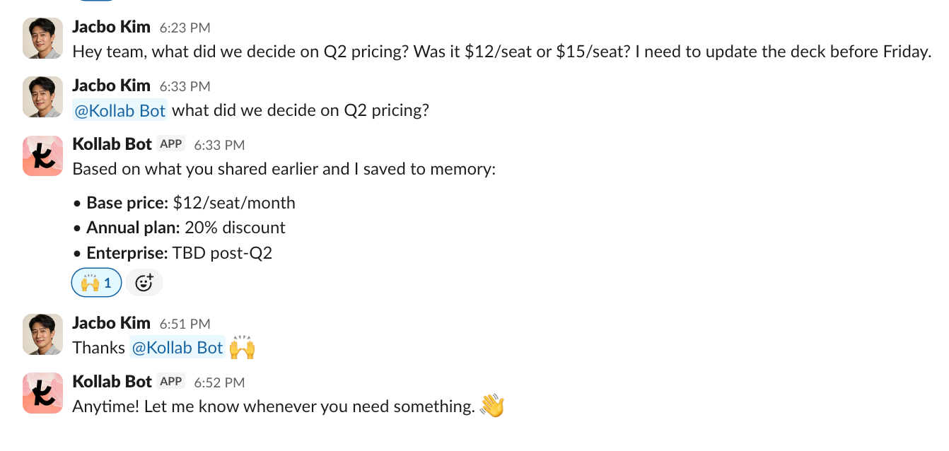 Bot이 Kollab 워크스페이스에 연결되어 프로젝트 맥락과 문서를 알고 있습니다. 팀원이 "우리 가격 정책이 뭐지?"라고 물으면 Bot이 대화 기억에서 답변을 바로 가져옵니다.
