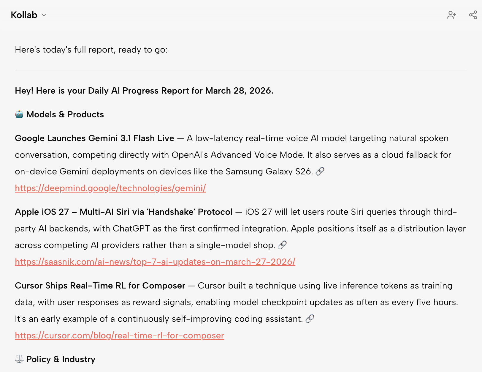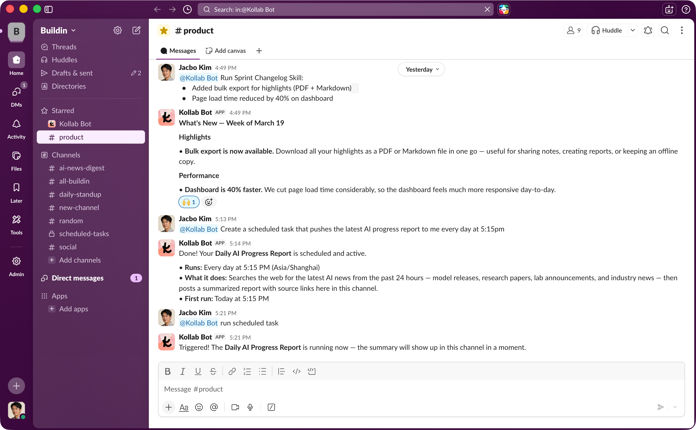 예. Kollab의 예약된 작업 기능과 결합하면, Bot을 설정하여 정해진 시간에 특정 채널로 일일 보고서, 주간 요약 또는 기타 다이제스트를 보낼 수 있습니다.