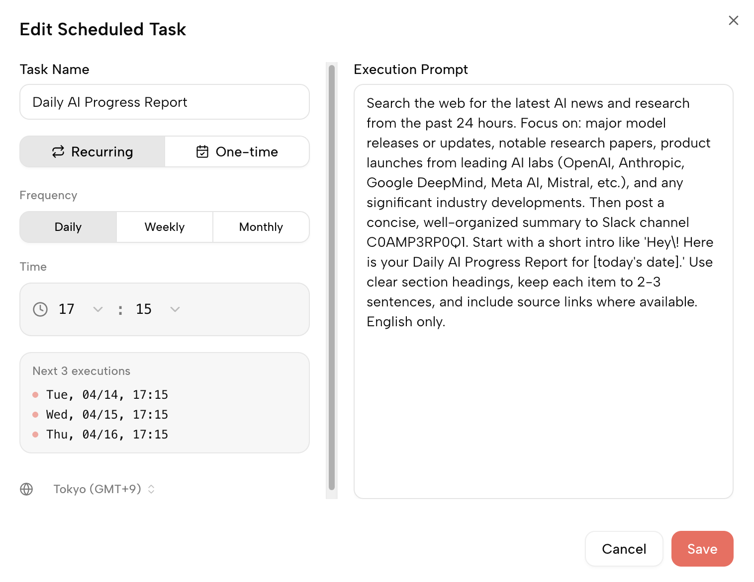 예약된 작업과 결합합니다. Bot이 일정에 따라 채널에 업데이트를 게시합니다 — 일일 업계 뉴스, 주간 요약. 중요한 정보가 당신을 찾습니다 — 당신이 찾을 필요가 없습니다.