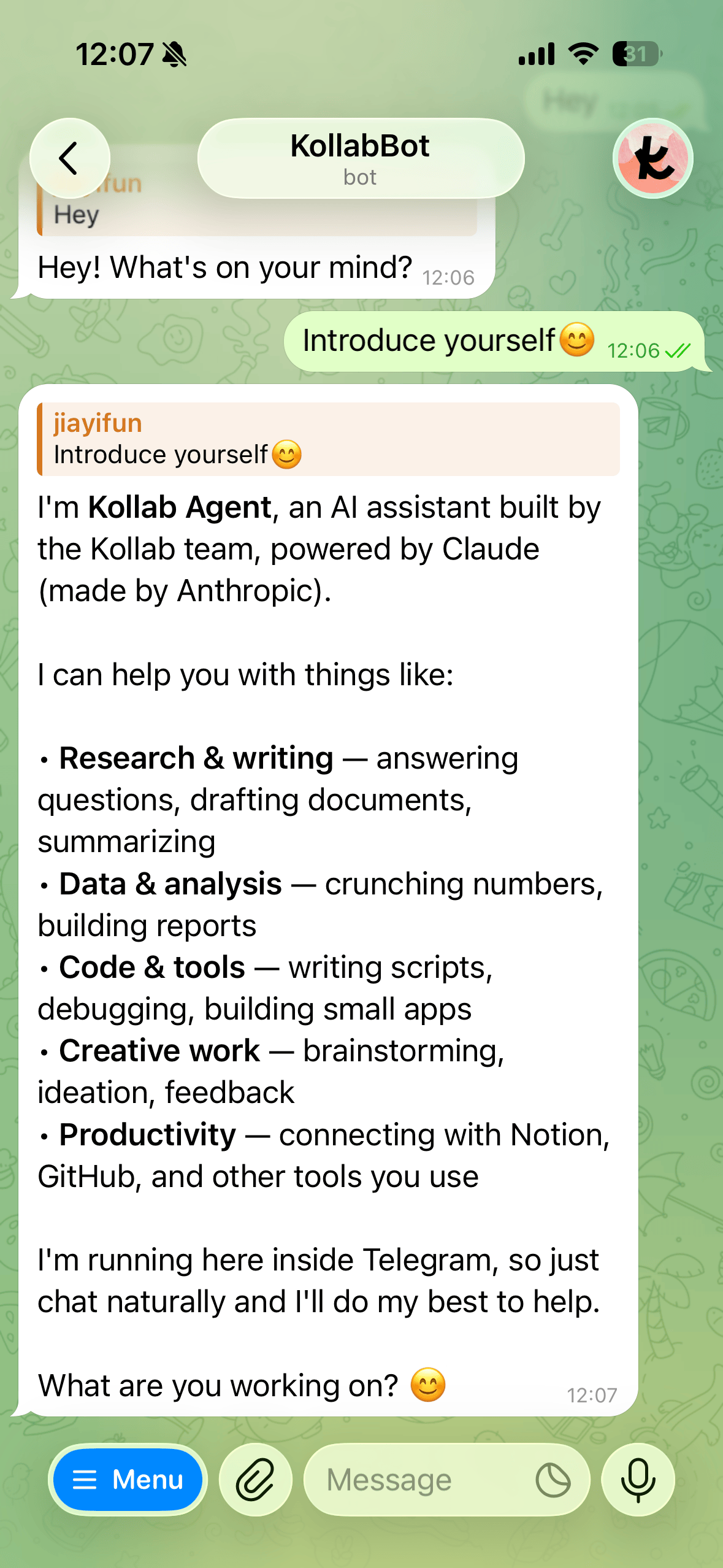 Bot이 Kollab 워크스페이스에 연결되어 문서, 지식베이스, 프로젝트 맥락에 액세스할 수 있습니다.